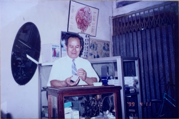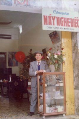 Ông Nguyễn Xuân Quế tại cửa hàng “Máy nghe điếc 101 Minh Khai” |